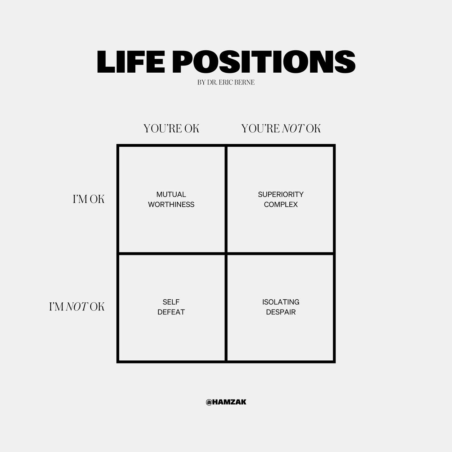 In these moments of masking my misery, I kept returning to psychiatrist Dr. Eric Berne’s “I’m OK - You’re OK” framework. It describes four life positions we unconsciously adopt—and I found pieces of myself in each quadrant: